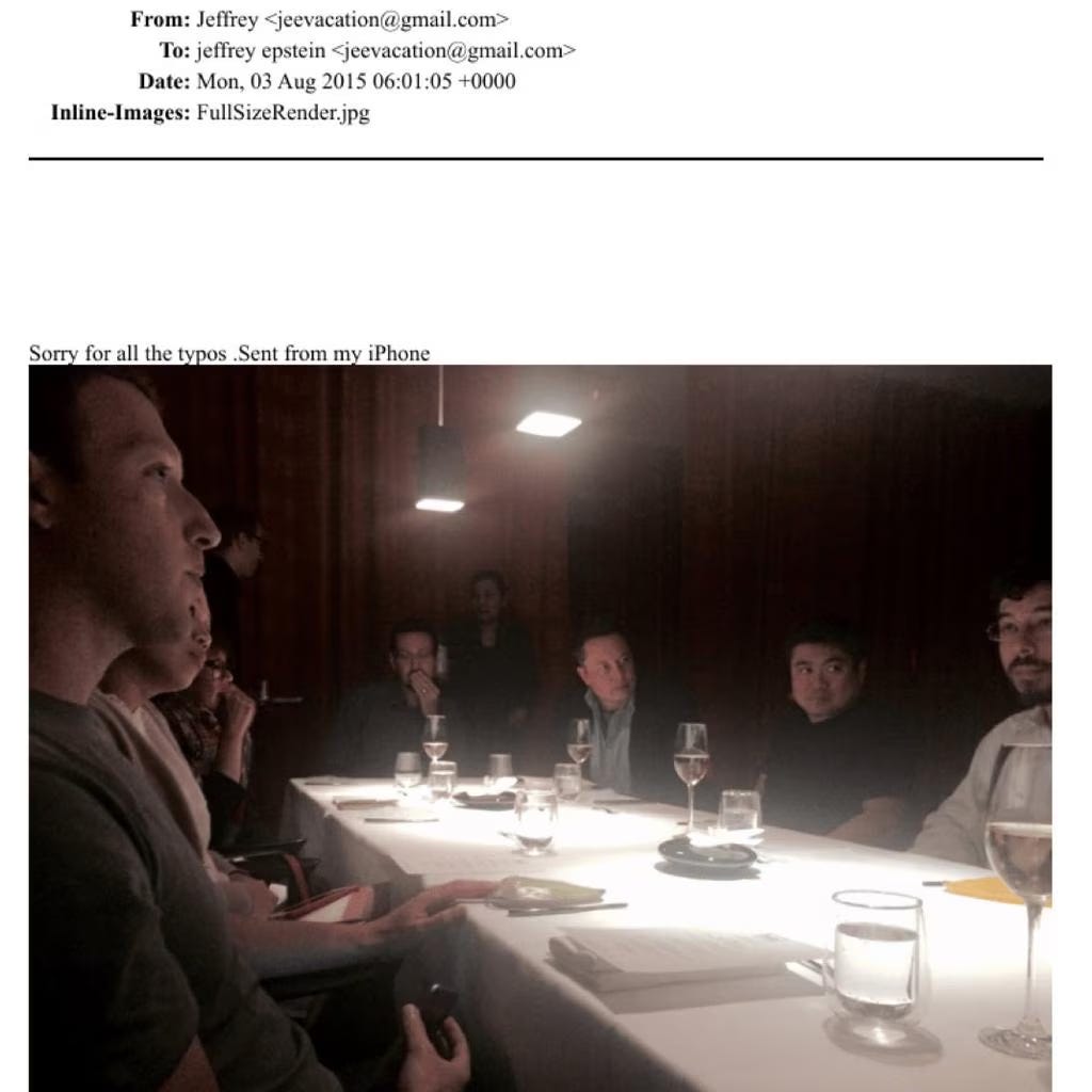 A photo from the “wild” 2015 dinner party that Jeffrey Epstein attended alongside Elon Musk, Mark Zuckerberg, and Peter Thiel was included in the Justice Department’s release of files related to the late sex offender. It’s unclear who took the photo, but Epstein emailed a copy of it to himself. Musk and Zuckerberg are pictured sitting at the table, along with Priscilla Chan, the Facebook founder’s partner.